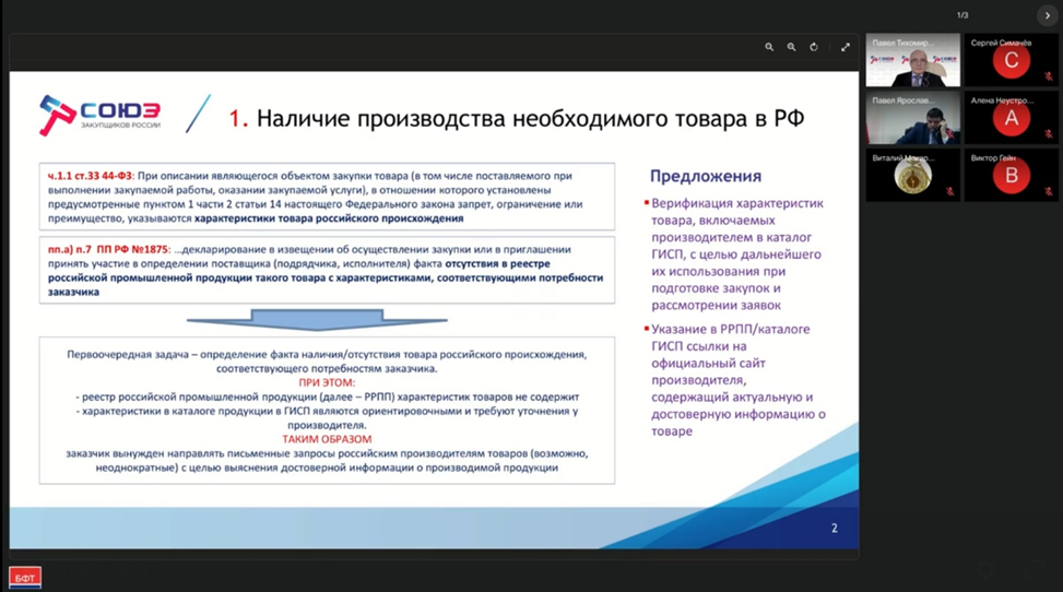 Обсуждение дополнили вопросом о товарах, не входящих в реестр. Отсутствие в законодательстве понятия «производство в промышленных масштабах» приводит к спорам при закупках, например, фруктов, которые участники декларируют как российские. Участники констатировали, что текущая редакция ПП № 1875 перекладывает на заказчиков непосильную аналитическую работу.
