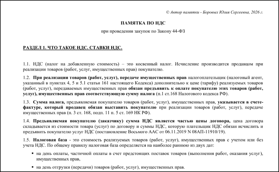Директор ООО «Факультет образовательных технологий» (Пермский край) Юлия Сергеевна Боровых представила детальную памятку по учету НДС на всех этапах закупки по 44-ФЗ. Документ, основанный на письмах регуляторов и судебной практике, охватывает вопросы от расчета НМЦК до действий при исполнении контракта, когда победитель применяет УСН.