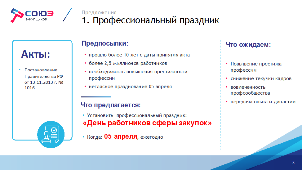 Предложено название профессионального праздника «День работников сферы закупок» и дату отмечания – 5 апреля – день принятия федерального закона о контрактной системе в сфере закупок №44-ФЗ.